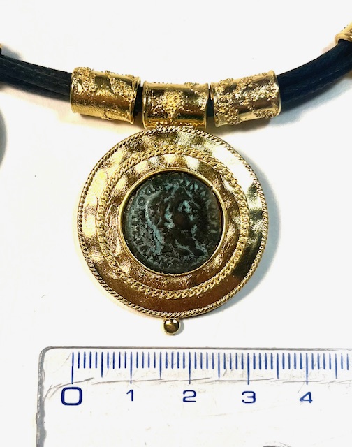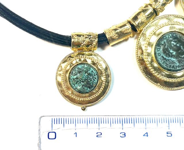 Necklace in 925 sterling silverplaccato 18k gold, with antiqued bronze coins and cordone in pelle. necklace in silver composta from tre scudi finemente cesellati: due laterali of uguali dimensioni and uno centrale, più ampio, on cui sono incastonate monete in antiqued bronze, simbolo of un’eredità che attraversa i secoli. le monete sono valorizzate from un doppio giro of filo ritorto che ne esalta la forma and il carattere, donando movimento and forza alla composizione. la lavorazione handmade conferisce profondità and raffinatezza alla struttura, mentre le linee sobrie del design bilanciano forza and armonia. un gioiello importante, of forte impatto simbolico, pensato for chi desidera indossare un frammento of storia with eleganza and raffinatezza contemporanea.