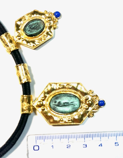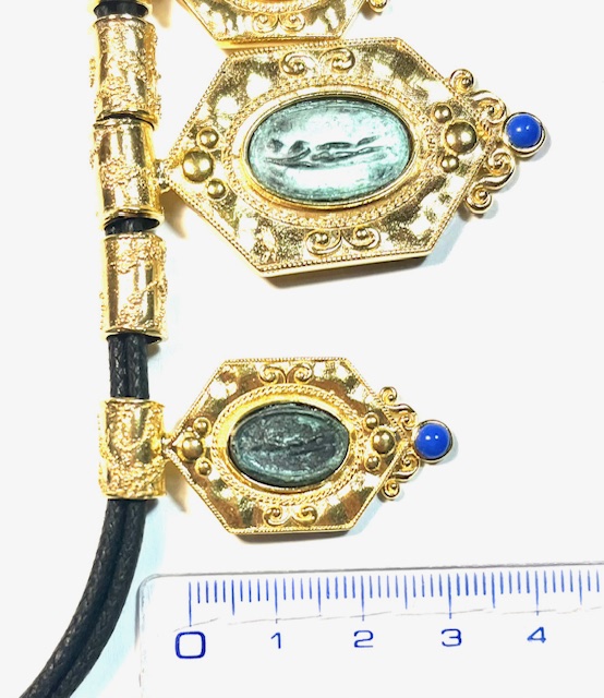 Necklace in 925 sterling silverplaccata 18k gold with antiqued bronze coins and cordone in pelle. necklace in silver composta from tre scudi finemente cesellati: due laterali, of uguali dimensioni, and uno centrale più ampio, on cui sono incastonate monete in antiqued bronze, simbolo of un’eredità che attraversa i secoli. le monete sono valorizzate from un doppio giro of filo ritorto che ne esalta la cesellatura, realizzata with estrema cura for dare risalto al volume, alla forma and al carattere, donando movimento and forza all’intera composizione. un gioiello importante, of forte impatto simbolico, pensato for chi desidera indossare un frammento of storia with eleganza and sensibilità contemporanea.
