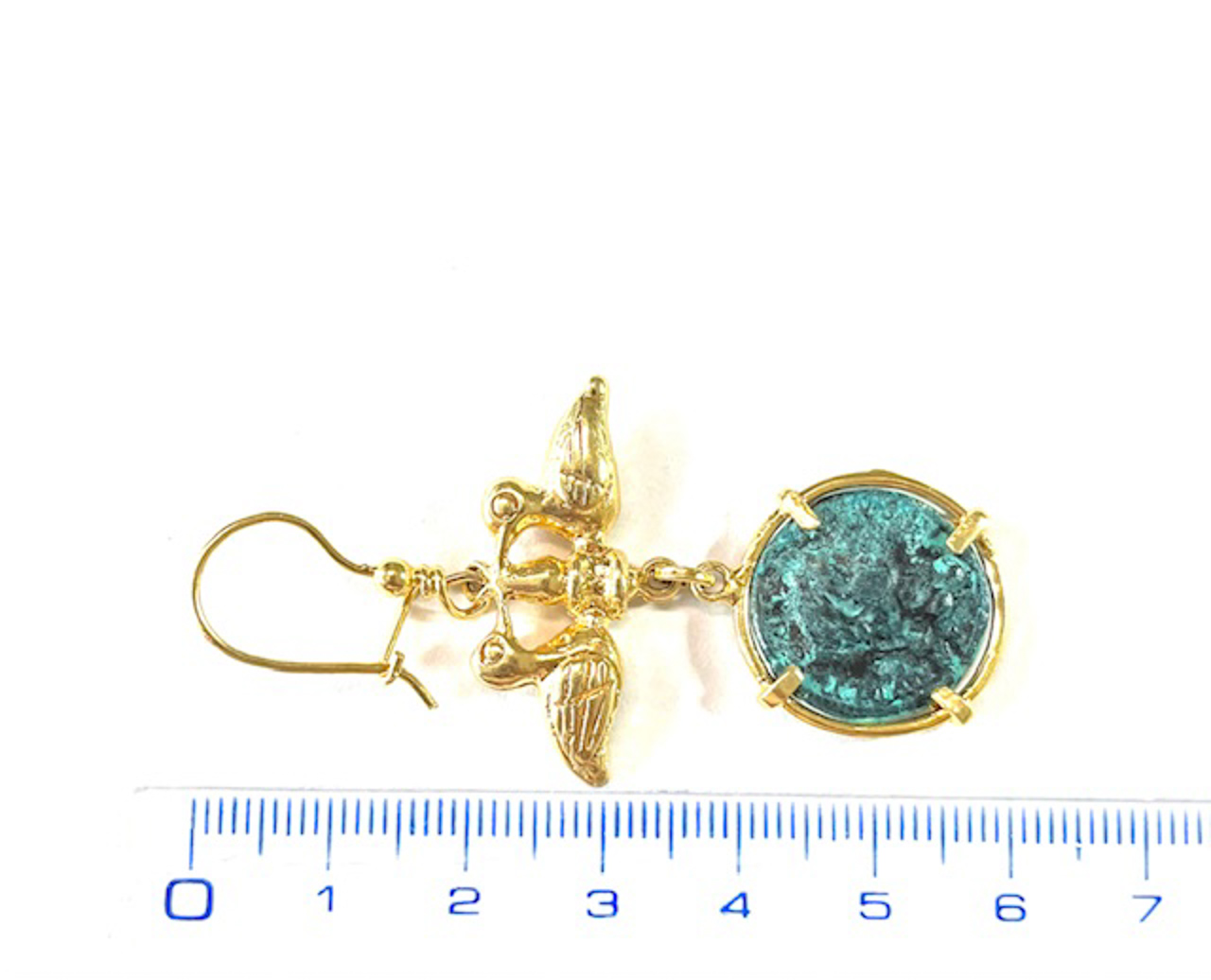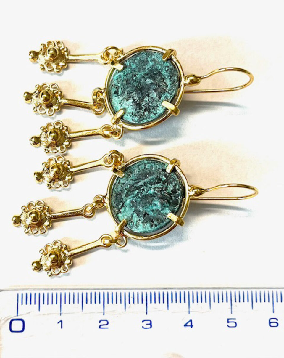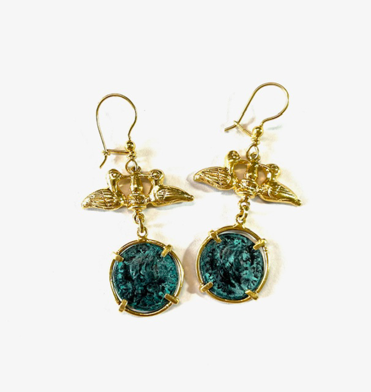 questo elegante earring in 925 sterling silver è impreziosito from una moneta in antiqued bronze, incastonata with quattro grappette che ne esaltano il design. la moneta raffigura gli imperatori and i conii dell’antica roma, evocando la grandezza dell’impero. la parte superiore dell’earring è arricchita from un simbolo etrusco: due oche che si guardano, un emblema of protezione and armonia, simbolo sacro for gli etruschi.