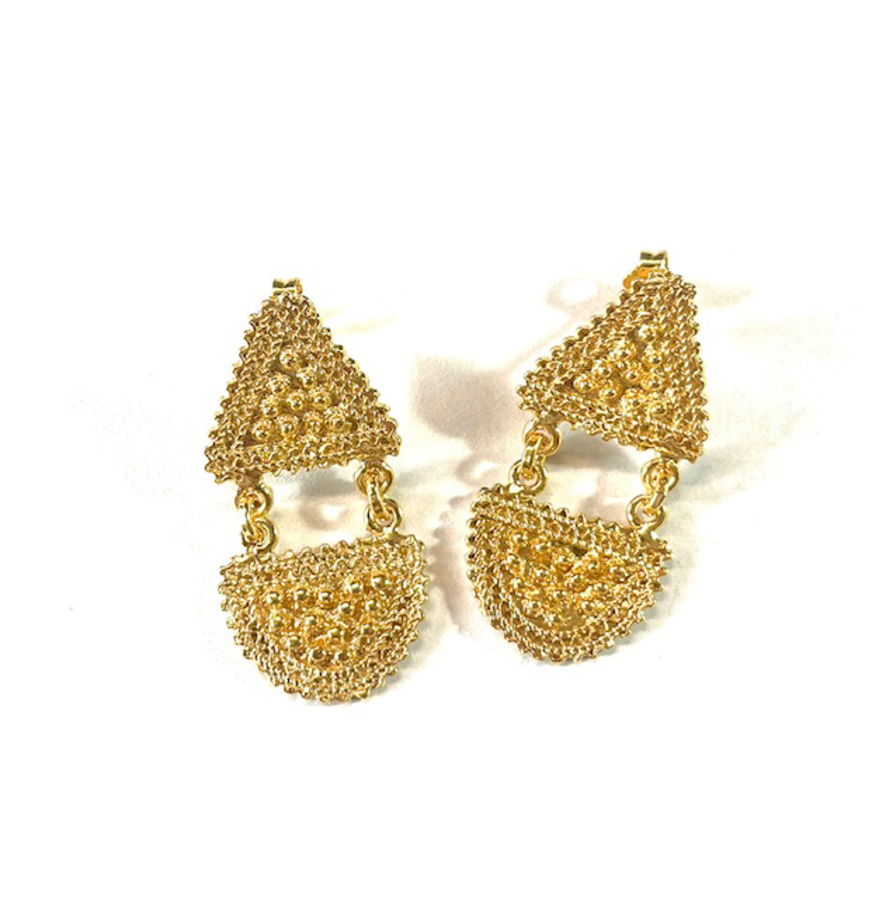 Stud earring in 925 sterling silver/°° 18k gold plated. earring in stile etrusco, realizzato with microfusione, composto from piccole palline assemblate and un perimetro frastagliato che crea un gioco of luci and ombre. un design raffinato che richiama l’arte orafa etrusca, with eleganza and unicità.