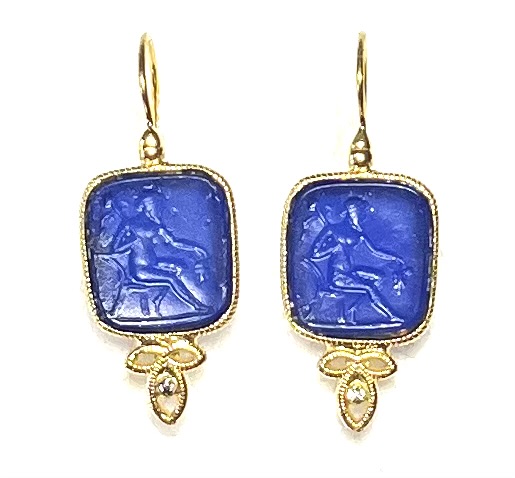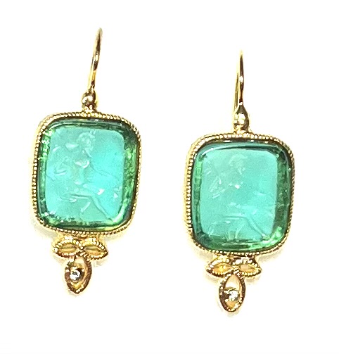 elegante earring handmade with glass paste raffigurante bacco, la divinità romana del vino, della festa and della socialità, ispirato ai baccanali, celebrazioni of gioia and condivisione.