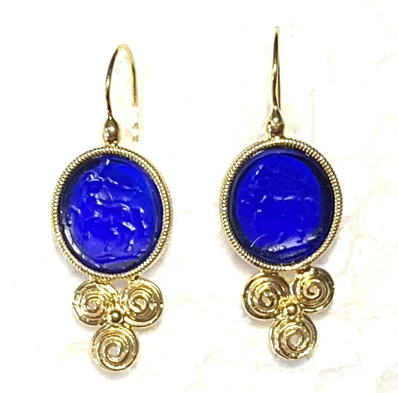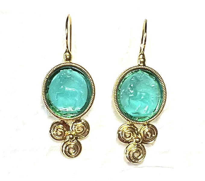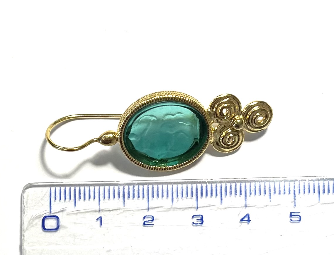 elegante earring in glass paste che rappresenta il sagittario, il centauro chirone, famoso for aver inventato le costellazioni for orientare gli argonauti in mare. il castone lavorato a mano è arricchito from tre girelle a spirale, che conferiscono al gioiello un tocco of raffinatezza and originalità.