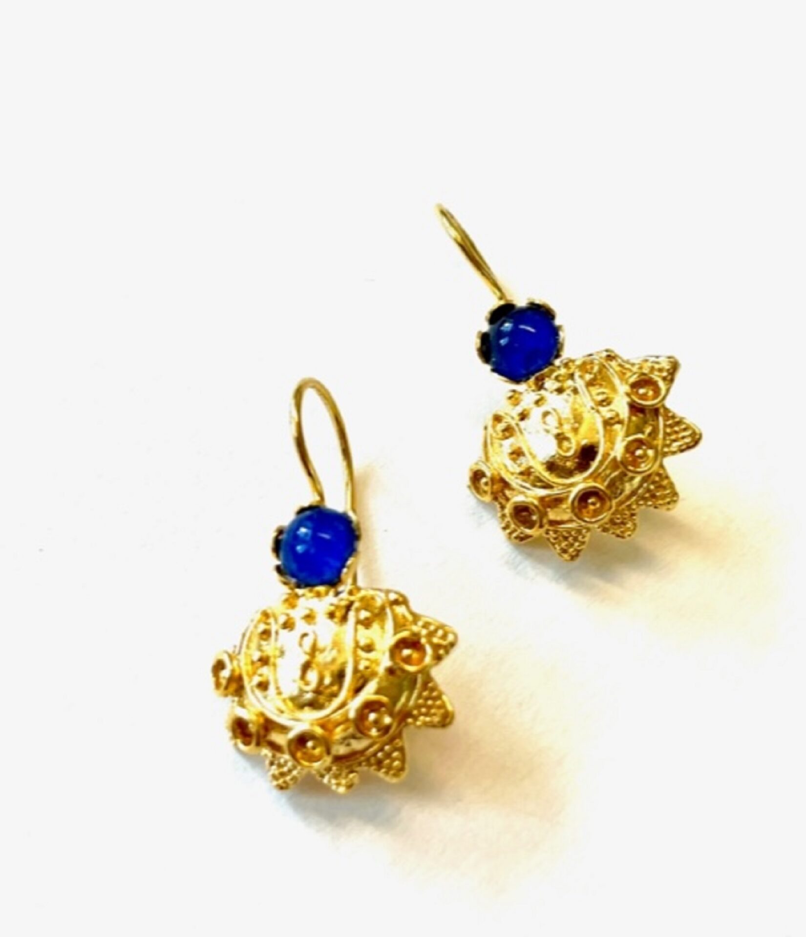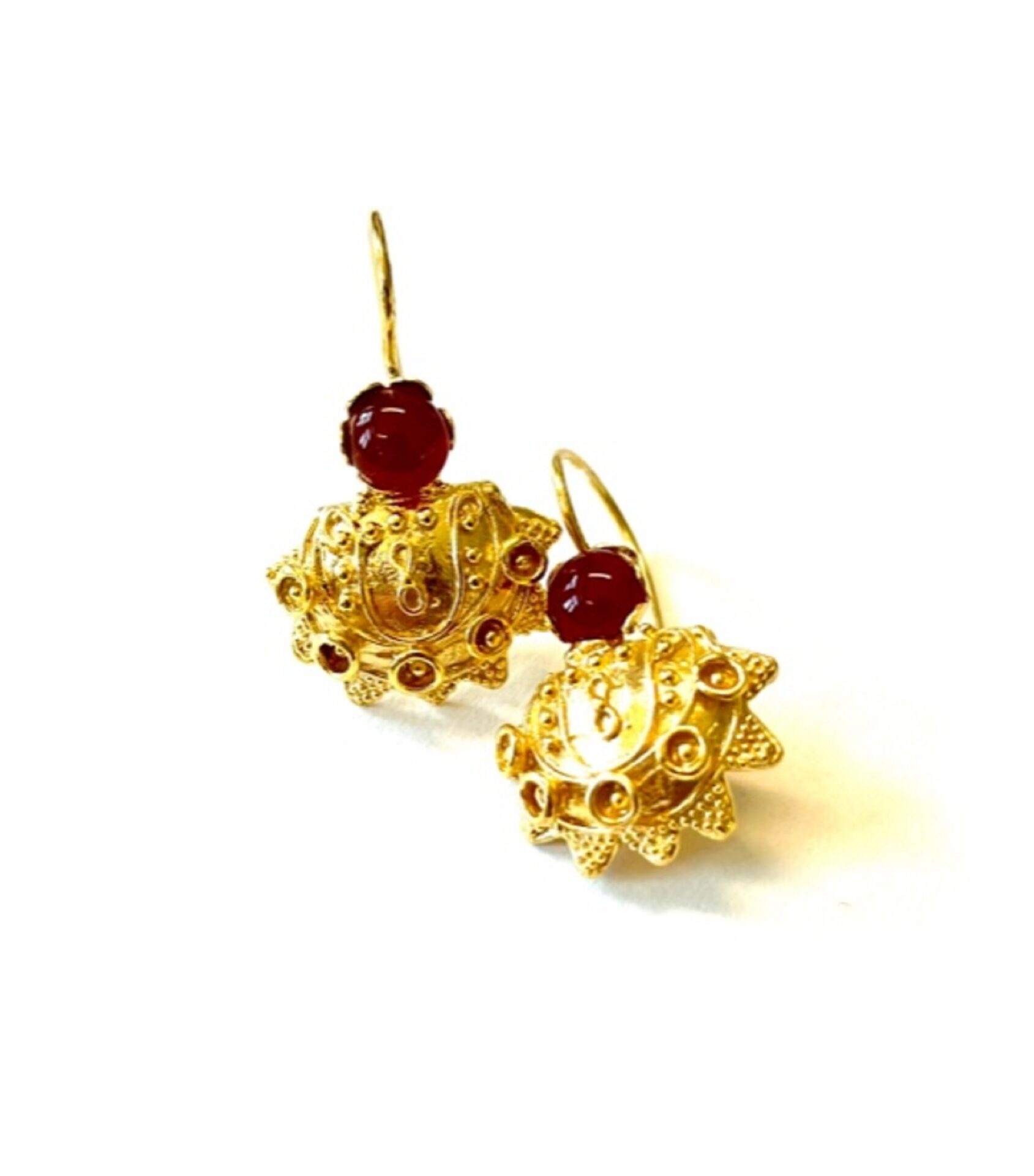 Hook earring in 925 sterling silver/°° 18k gold plated with semi-precious stones. elegante earring etrusco, impreziosito from stones posizionate in un castone smerlettato. la parte sottostante presenta una raffinata lavorazione with la tecnica della granulazione, eseguita with grande maestria. il design, with le sue punte finali che accompagnano il modello bombato, conferisce un tocco of originalità and raffinatezza al gioiello.