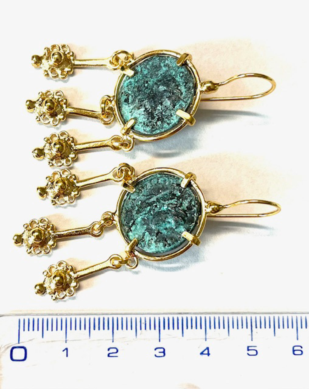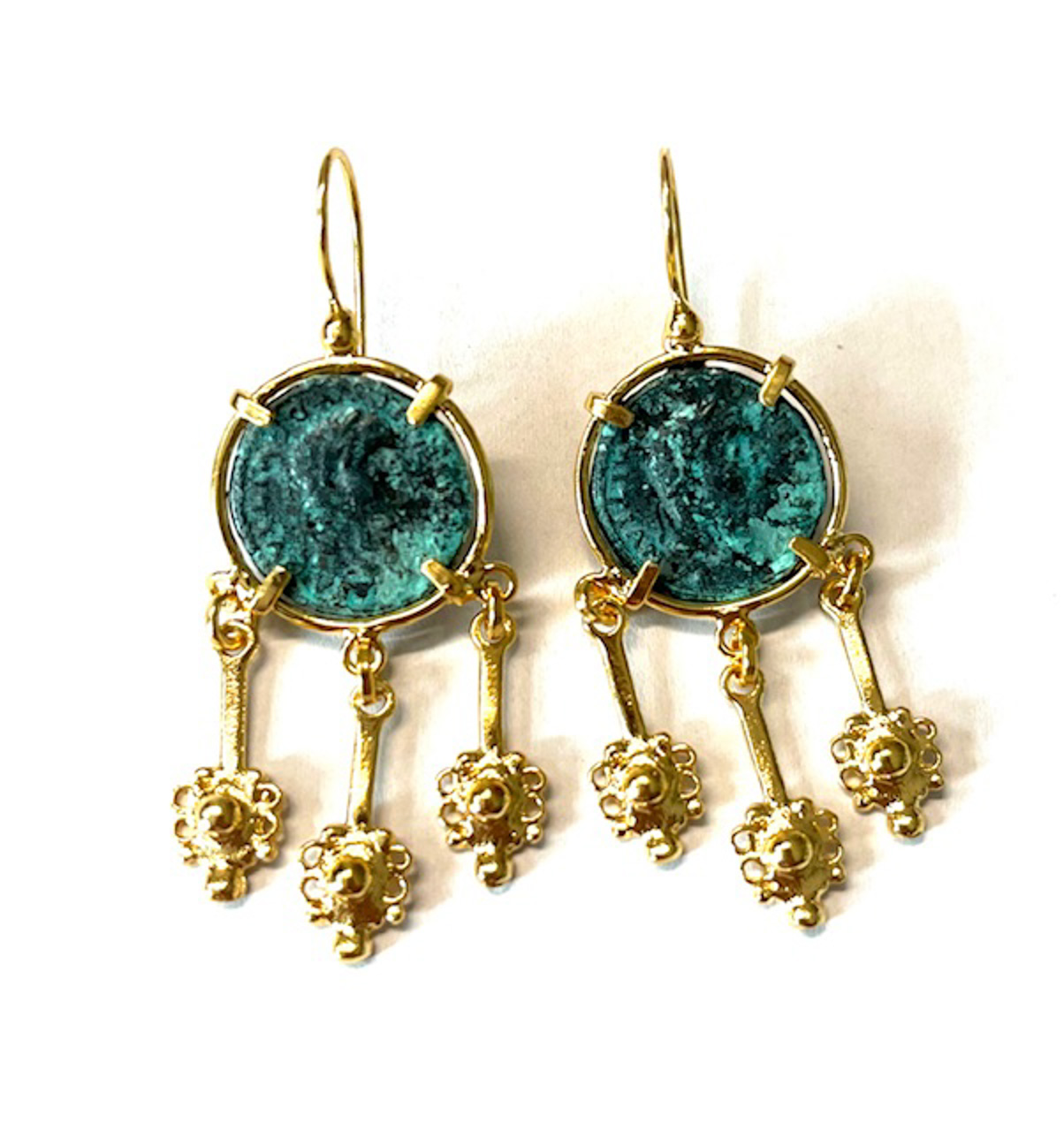 Hook earring in 925 sterling silver/°° 18k gold plated with antiqued bronze coins. questo elegante earring in 925 sterling silverè impreziosito from una moneta in antiqued bronze, raffigurante gli imperatori and i conii dell’antica roma. la moneta, incastonata with quattro grappette, è arricchita from pendants ispirati agli stendardi delle vittorie romane, donando al gioiello un fascino storico and without tempo.
