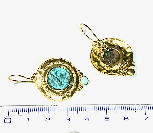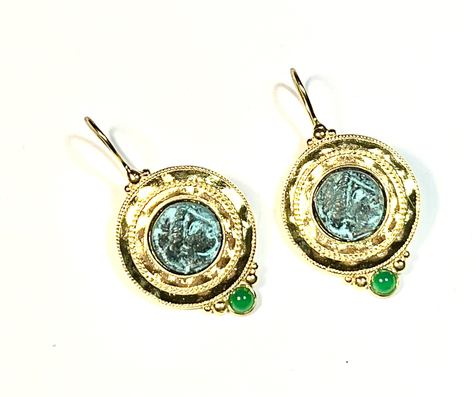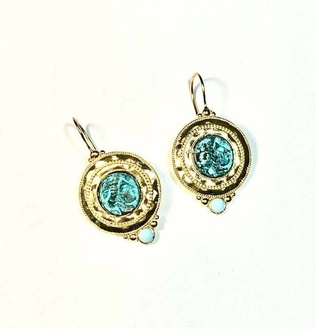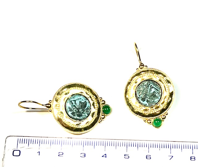 questi hook earrings uniscono eleganza and carattere. al centro spicca una moneta anticata che raffigura l’immagine of antichi guerrieri, simbolo of forza and storia. il bordo è impreziosito from un delicato filo ritorto, che dona un tocco handmade al design. la cesellatura rende l’earring leggermente bombato, with volumi messi in risalto dalla lucentezza del metallo lavorato. alla base, una semi-precious stone aggiunge color and raffinatezza, rendendo questi earrings unici and versatili. perfetti from indossare ogni giorno o for completare un look originale.