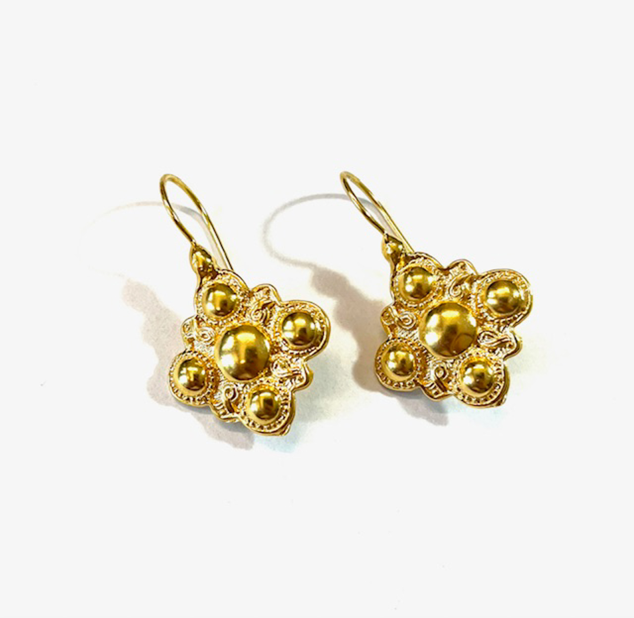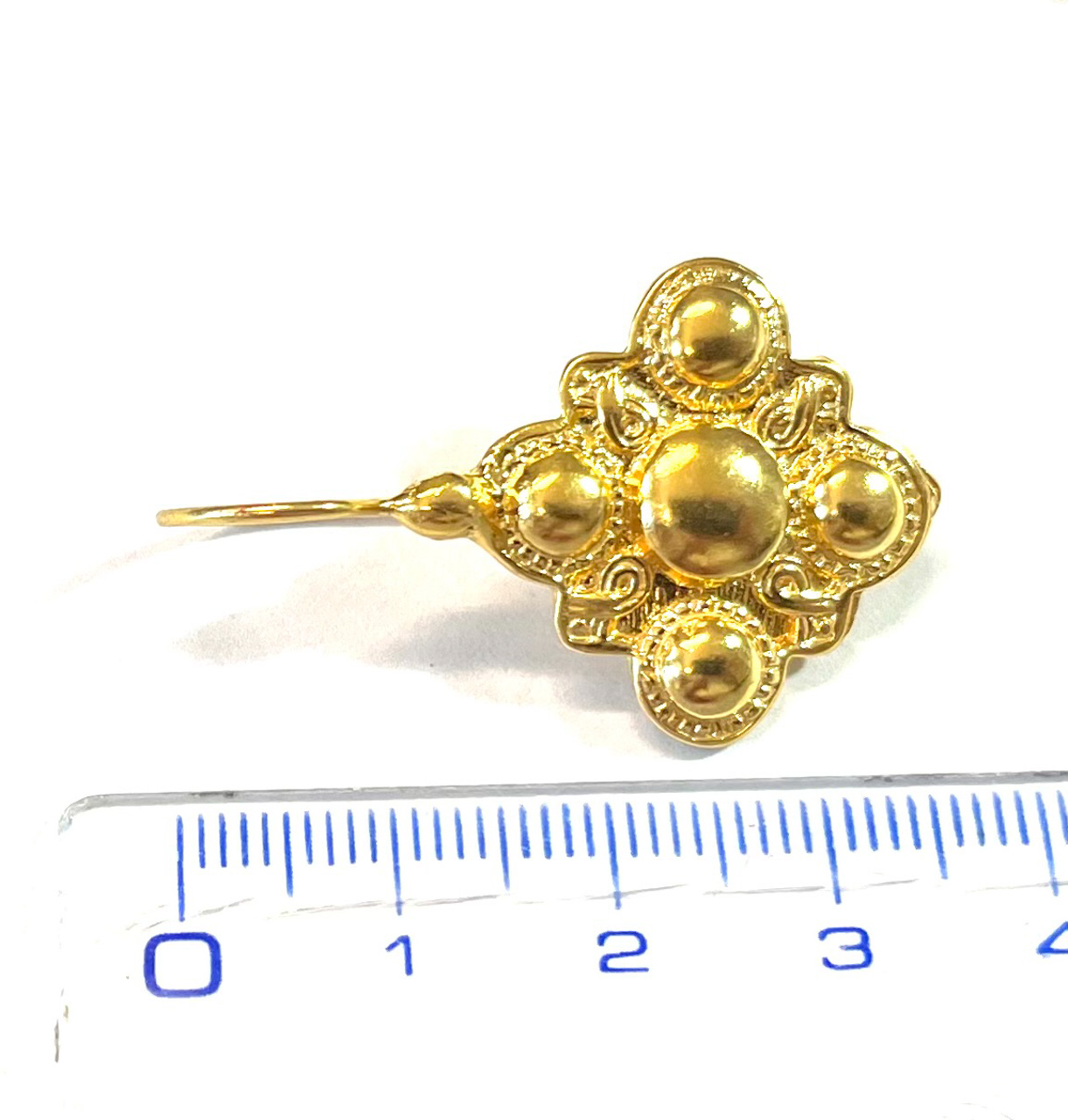 Hook earring in 925 sterling silver/°° 18k gold plated. elegante earring etrusco realizzato with una placca decorated from 5 coppe lucide, che conferiscono luminosità and tridimensionalità. la lavorazione richiama la tipica arte orafa etrusca, with un richiamo simbolico alla croce, presente in molte culture antiche come segno of protezione and spiritualità.