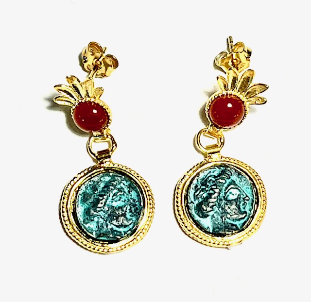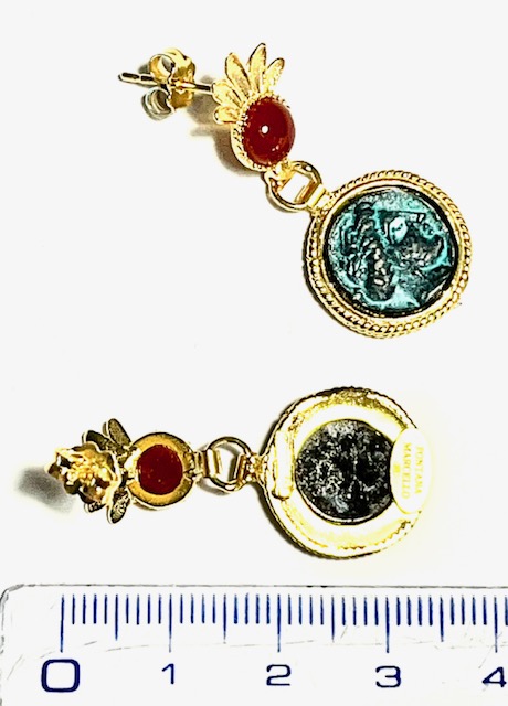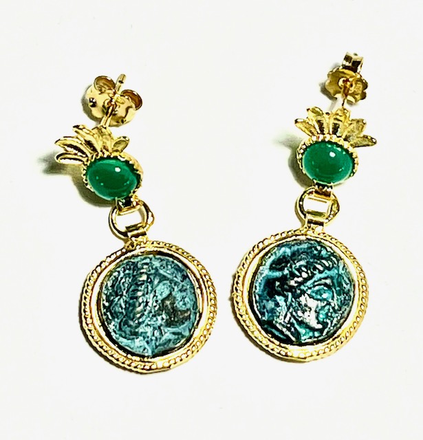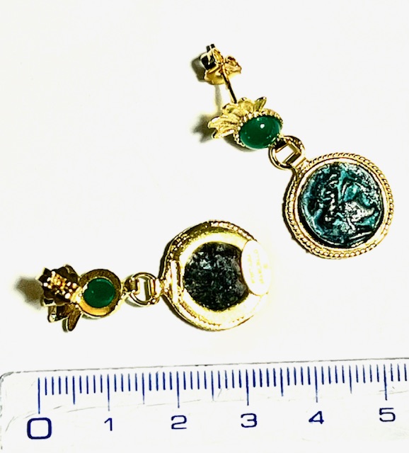earring in stile romanico, arricchito dalle classiche monete romane che raffigurano gli antichi guerrieri and imperatori, simboli of potere, coraggio and grandezza. la parte superiore è rifinita from una stone incastonata che ne esalta la luminosità and aggiunge un tocco of eleganza, creando un perfetto equilibrio tra forza storica and raffinatezza handmade. un gioiello dal fascino antique, pensato for chi ama indossare la storia with stile.