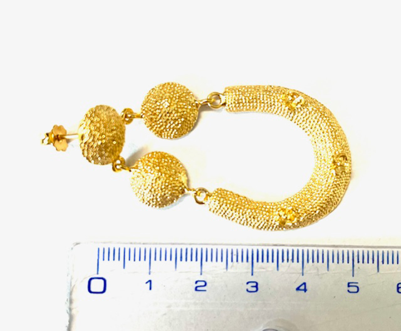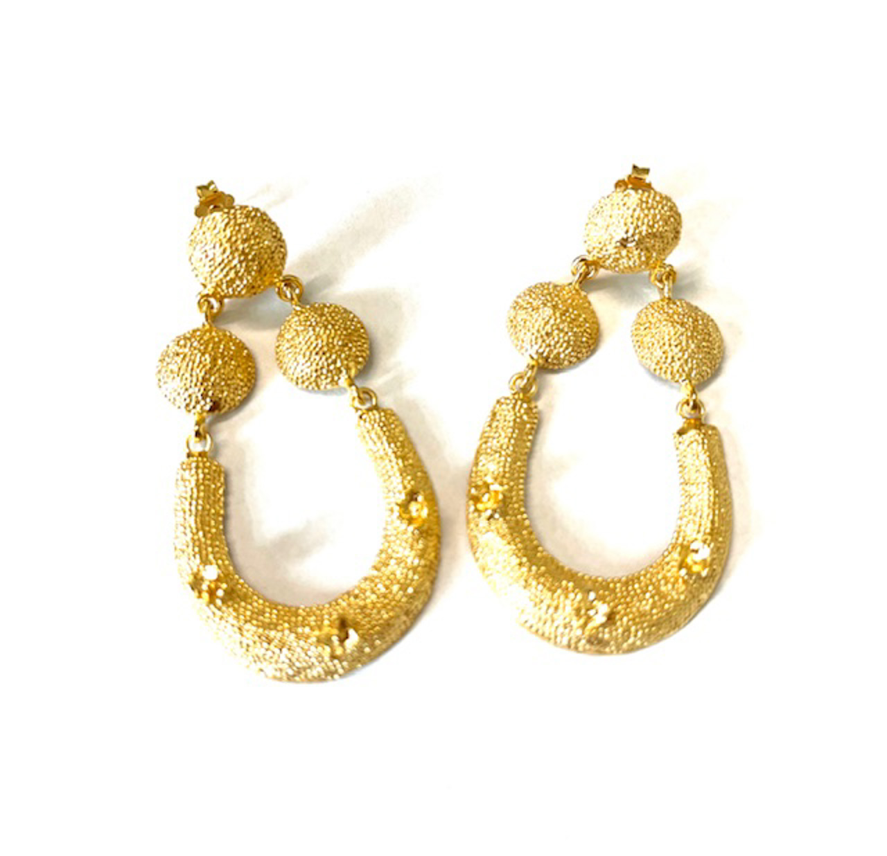 Stud earring in 925 sterling silver/°° 18k gold plated. elegante earring in stile etrusco, realizzato with lavorazione handmade and impreziosito dalla tecnica della granulazione. questo antique metodo, che prevede l’applicazione of minuscole sfere of metallo, esalta i volumi and i giochi of luce, donando profondità and raffinatezza al gioiello. un pezzo unico che richiama la maestria orafa degli antichi etruschi.