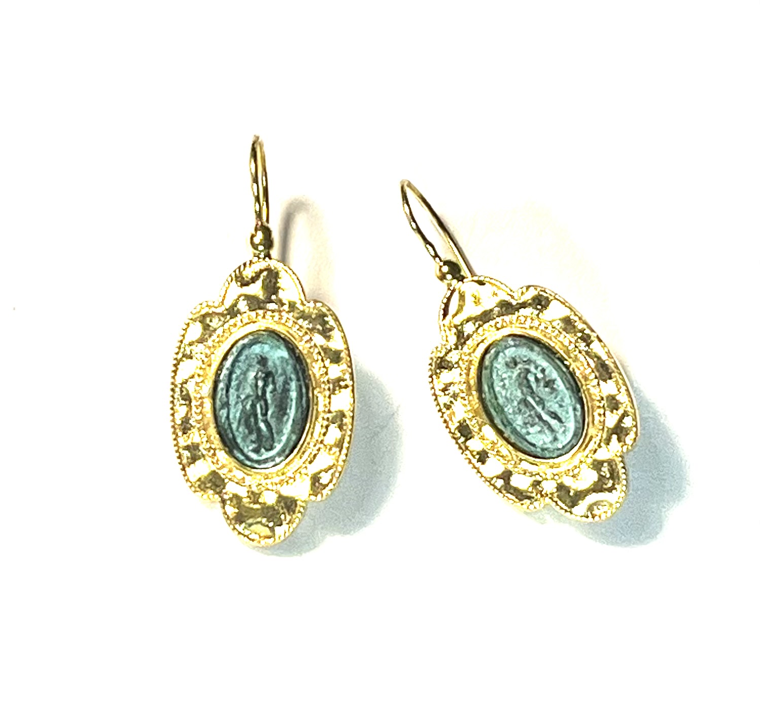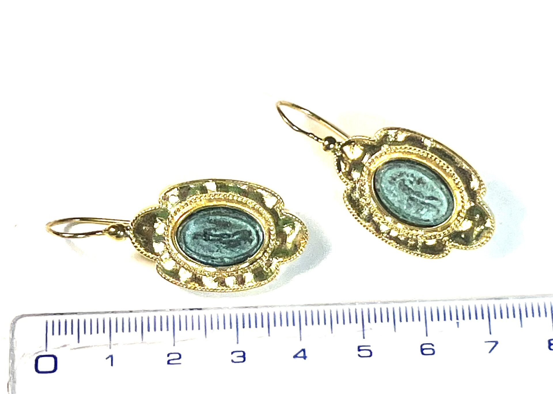 Earring in 925 sterling silverplaccato 18k gold, with antiqued bronze coin. un gioiello dal fascino antique and ricercato, questi earrings catturano lo sguardo with il loro elemento centrale: uno scudo finemente cesellato che accoglie una moneta anticata che riproduce l’immagine of una figura romana, simbolo of forza and autorevolezza. la lavorazione handmade dello scudo ne esalta i volumi grazie a una cesellatura meticolosa, mentre i due giri of filo ritorto che lo incorniciano aggiungono carattere and un tocco of eleganza classica. perfetto for chi ama i dettagli unici and i richiami alla tradizione, questi earring sono un accessorio without tempo, capace of raccontare una storia antica with uno stile profondamente contemporaneo.