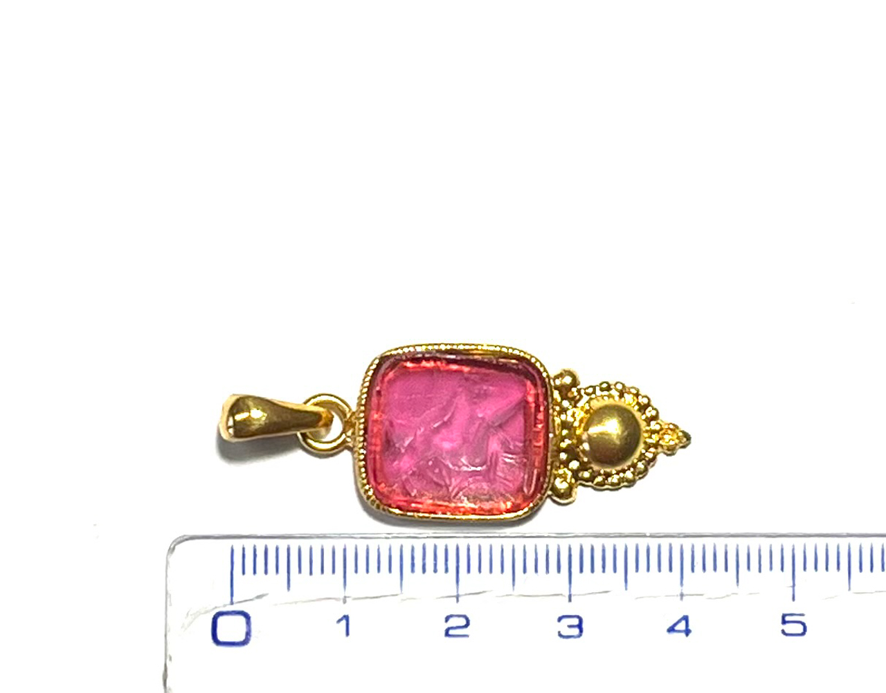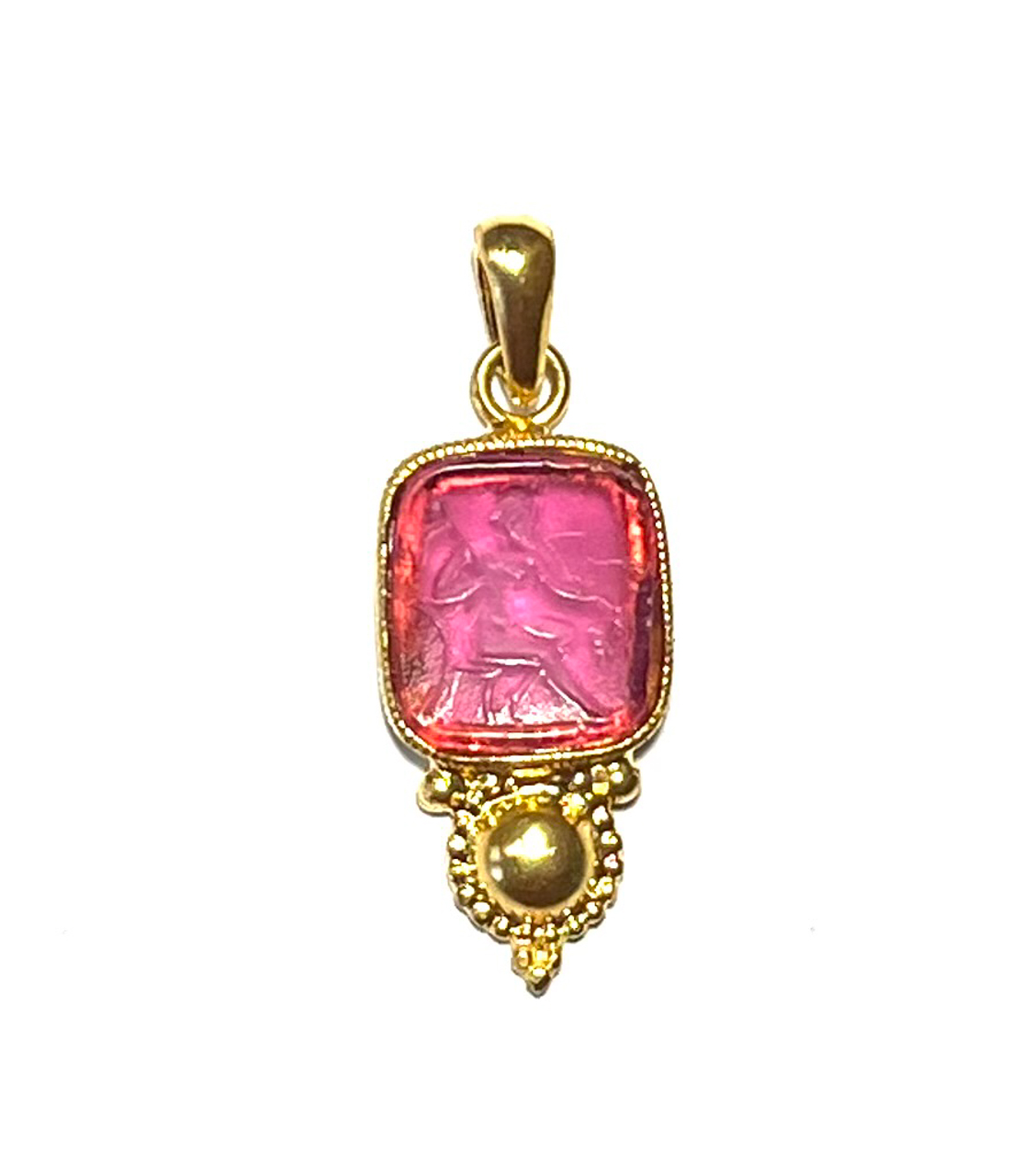Pendant with glass paste in 925 sterling silver/°° 18k gold plated. pendant elegante with glass paste of color rubinite, avvolta in una montatura a filo ritorto che ne esalta la brillantezza. la glass paste raffigura bacco, dio del vino and della festa, simbolo of gioia and condivisione. un gioiello che celebra l’energia vitale and lo spirito conviviale dell’antichità. pendant dal fascino esclusivo, ispirato all’antichità, capace of esaltare l’eleganza and la personalità of chi lo indossa. un gioiello unico che unisce storia and raffinatezza.