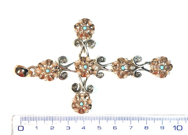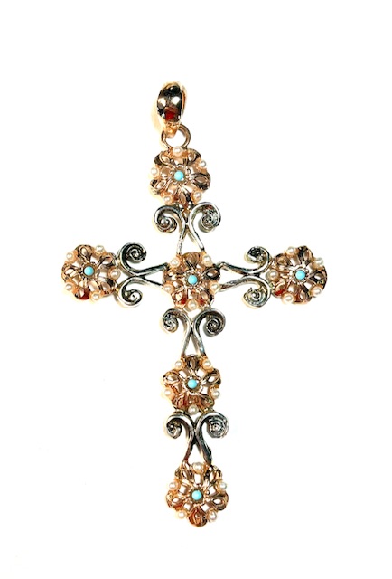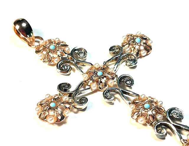 Pendant in 925 sterling silverplaccato rose gold 18 kt with micro pearls bianche and turchesi. raffinato pendant in silver a forma of croce, impreziosito from micro pearls and turchesi incastonati all’interno of delicati motivi floreali. gli elementi arricciolati che si alternano al decoro floreale sono lucidati for esaltare la forma and mettere in risalto i dettagli artigianali, conferendo al gioiello un’eleganza armoniosa and without tempo.