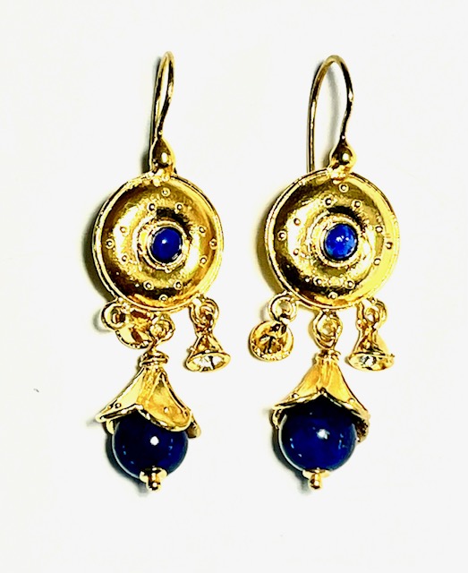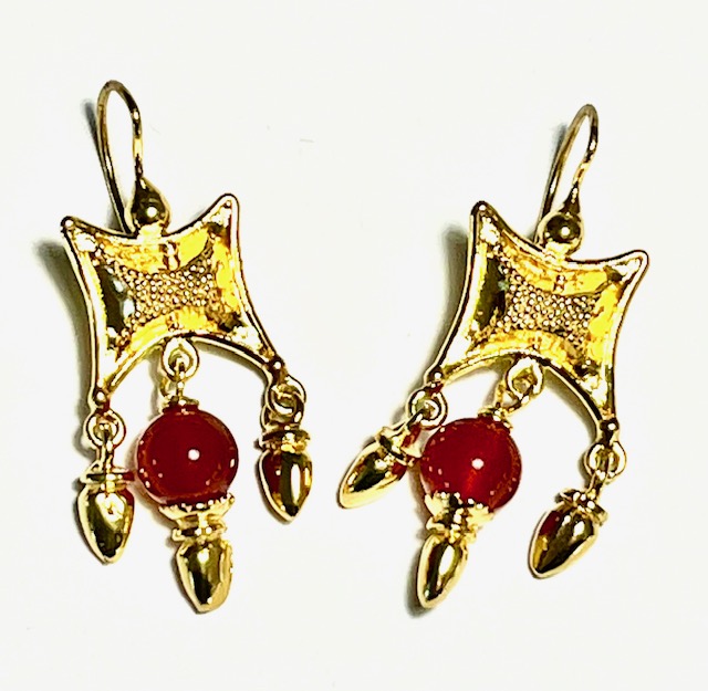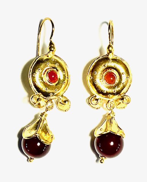 Hook earring in 925 sterling silverplaccato 18k gold with antiqued bronze coin and semi-precious stones.